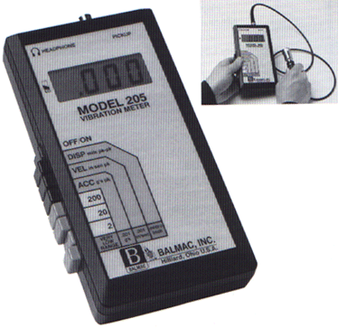 DEscRIPTION The Model 205 is a protable, hand-held digital vibration meter that measures machinery vibration. It is used to measure vibration on all types of rotating machinery including fans, motors, pumps, compressors as well as many other types of industrial machines.